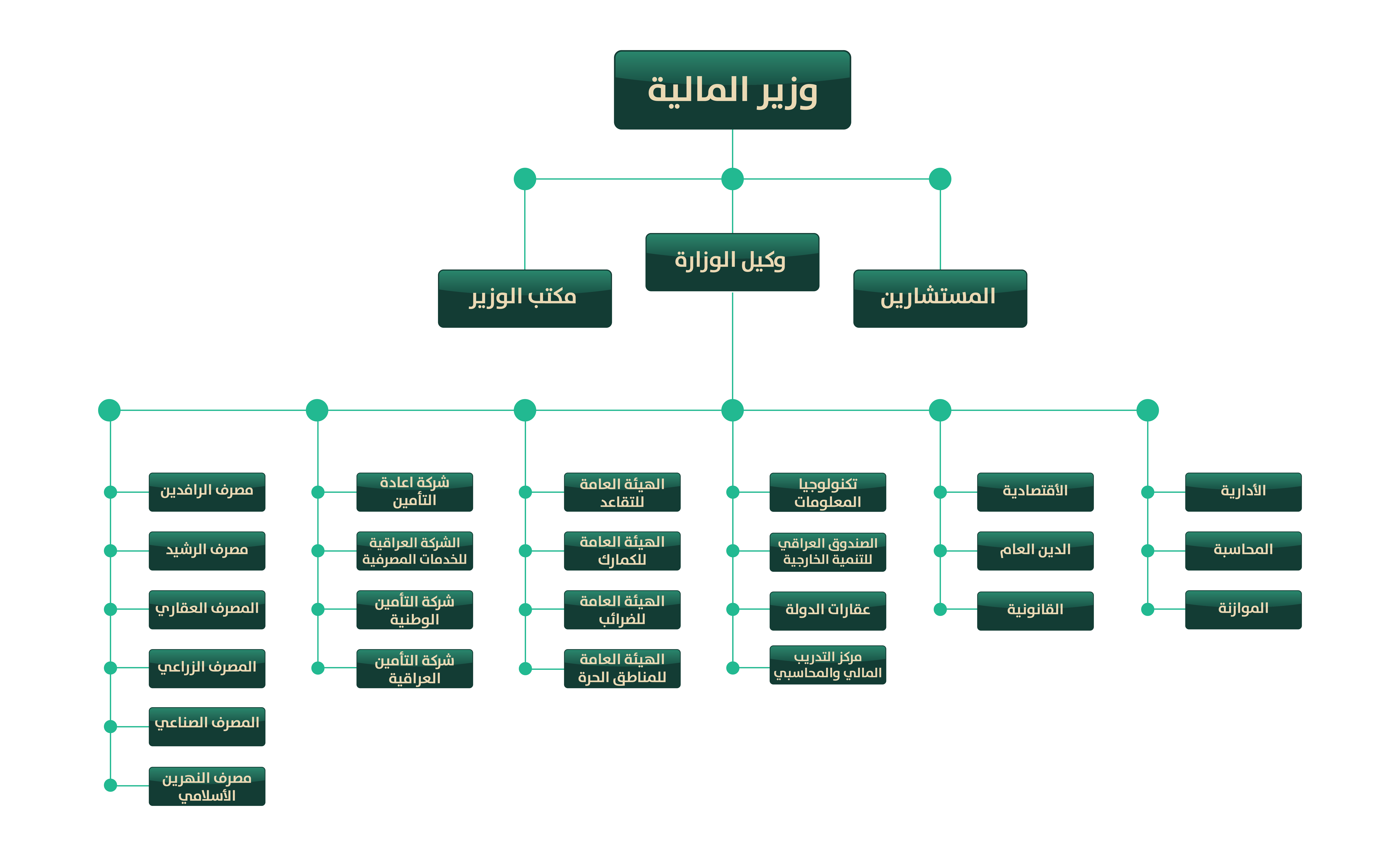 المستشار المالي:- يرتبط بالوزير مباشرة ويكون مسؤولاً عن تقديم الخبرة فيما يكلف به, و إعداد تقارير ودراسات وبحوث تتعلق باختصاصات الوزارة, و أية مهام أخرى يكلفه بها الوزير. ويساعد المستشار المالي في القيام بمهامه قسم فني يتألف من عدد من ذوي الخبرة و الاختصاص في النشاطات النوعية لاختصاصات الوزارة.